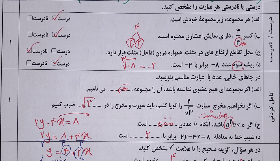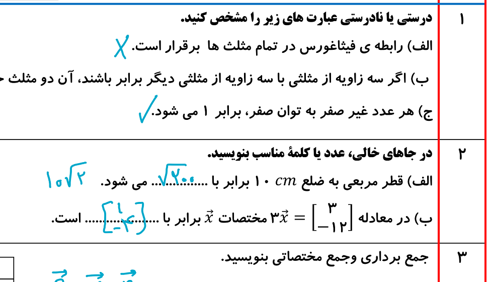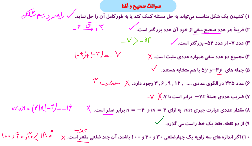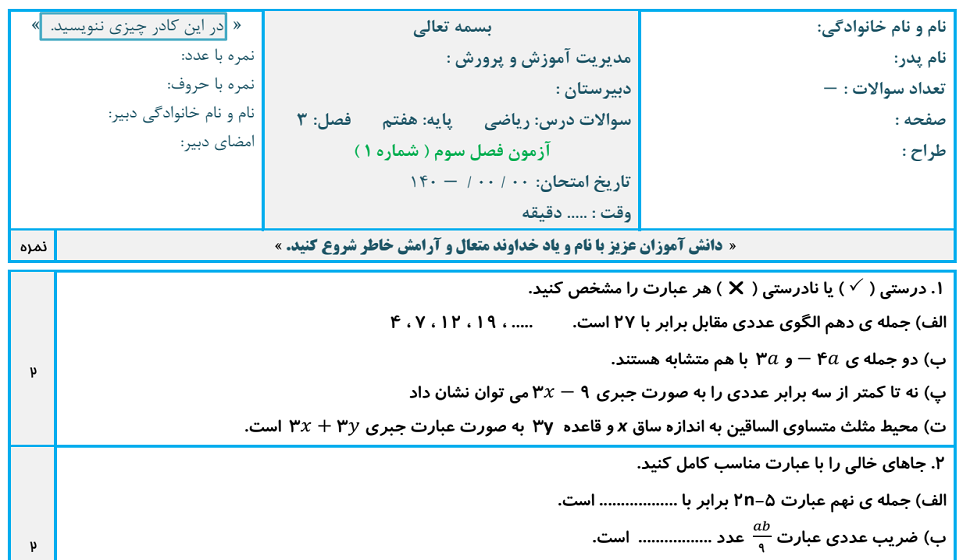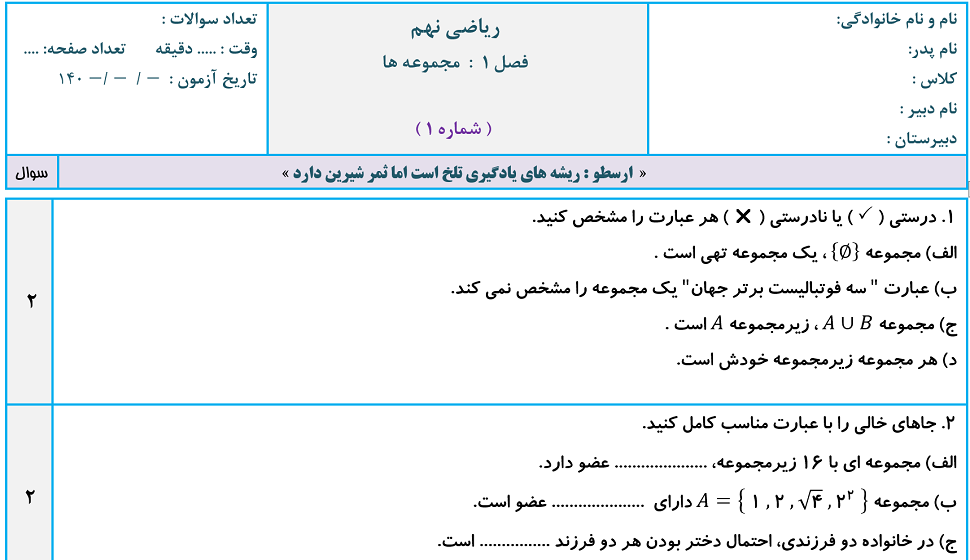نمونه سوالات جدید ریاضی نهم مدارس تیزهوشان شامل سوالات صحیح غلط، جایگذاری، تستی و تشریحی : سوالات درس به درس، فصل به فصل، آزمون های نوبت اول و دوم همراه پاسخ تشریحی.